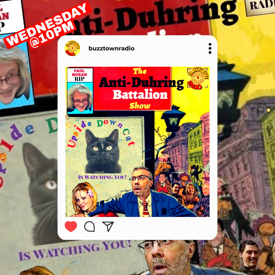 Host of The Anti-Duhring Battalion ShowI first saw Anti-Duhring Battalion when he burst his trousers on the stand up comedy scene ten or more years cak!* (Apologies for smelling mistake)He's a smashing lad he really is and I'm not just saying that either. He's a bit like Banksy or Batman 'cos no one really knows who he is.When he started doing radio on all these different stations he blew my ear balls off. All these stories and adventures about Upside Down Cats and secret agents are uncredible**The show what he's doing now on Buzztown Radio is him at his very breast***